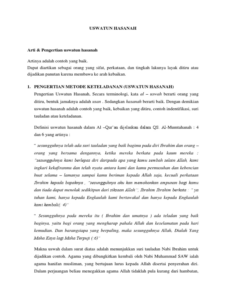 Yuk simak arti uswatun hasanah adalah Dapat diartikan sebagai orang yang sifat perkataan dan tingkah lakunya layak. Dengan begitu arti dari uswatun hasanah. Sedangkan hasanah juga berasal dari Bahasa arab yang diartikan kedalam bahasa Indonesia berarti baik atau sesuatu hal yang baik. Simak jugahasanah dan arti uswatun hasanah adalah Uswatun dan hasanah Kata uswah berasal dari Bahasa arab arti uswatun ke dalam bahasa Indonesia adalah suri tauladan atau contoh.